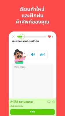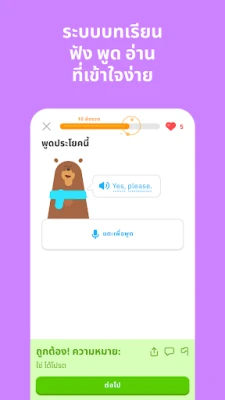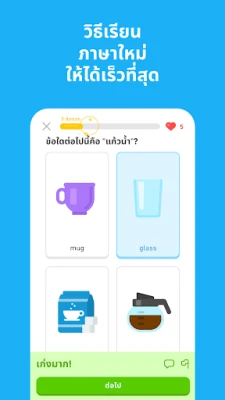 สัมผัสประสบการณ์การเรียนรู้ที่พลิกโฉมมาในรูปแบบเกมอันแสนสนุก Duolingo ทำให้การฝึกฝนทักษะการพูด อ่าน เขียน และฟัง กลายเป็นเรื่องเพลิดเพลิน พร้อมตัวละครน่ารักๆ ที่จะช่วยให้คุณจำศัพท์และหลักไวยากรณ์ได้ง่ายขึ้น หลักสูตรของเราถูกสร้างสรรค์ขึ้นโดยผู้เชี่ยวชาญด้านภาษาอย่างพิถีพิถัน โดยอ้างอิงจากหลักการสอนที่ได้รับการพิสูจน์แล้วว่าช่วยส่งเสริมการจดจำระยะยาว เพื่อให้คุณก้าวหน้าอย่างแท้จริงในทุกก้าว