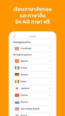 ปลดล็อกศักยภาพด้านภาษาใหม่ๆ ให้ชีวิตของคุณ ไม่ว่าจะเป็นการเดินทาง การศึกษาต่อ การเสริมสร้างอาชีพ หรือเชื่อมสัมพันธ์กับคนสำคัญ Duolingo คือเพื่อนร่วมทางที่ได้รับการออกแบบโดยผู้เชี่ยวชาญด้านภาษาศาสตร์ และเป็นที่ไว้วางใจของผู้เรียนนับร้อยล้านคนทั่วโลก เตรียมพร้อมที่จะสนทนาได้อย่างมั่นใจในภาษาสเปน ฝรั่งเศส จีน อิตาลี เยอรมัน อังกฤษ และอีกหลากหลายภาษา พร้อมเปิดโลกทัศน์ใบใหม่ให้คุณ