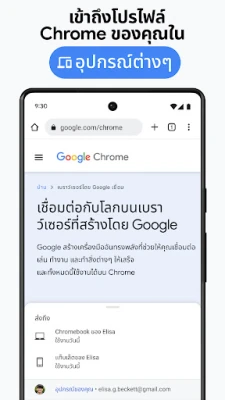 เชื่อมต่อและใช้งาน Chrome ได้อย่างราบรื่นไม่ว่าคุณจะอยู่ที่ไหนหรือใช้อุปกรณ์ใด ด้วยการลงชื่อเข้าใช้เพียงครั้งเดียว ข้อมูลสำคัญของคุณ เช่น บุ๊กมาร์ก แท็บที่เปิดอยู่ และรหัสผ่าน จะซิงค์กันในทุกอุปกรณ์ ไม่ว่าจะเป็นโทรศัพท์ คอมพิวเตอร์ หรือแท็บเล็ต จัดระเบียบการทำงานของคุณให้ง่ายขึ้นด้วยการสร้างกลุ่มแท็บ และประหยัดเวลาอันมีค่าด้วยฟังก์ชันการป้อนข้อมูลอัตโนมัติ ซึ่งจะเติมเต็มข้อมูลการชำระเงิน ที่อยู่ หรือรหัสผ่านที่คุณบันทึกไว้ให้โดยไม่ยุ่งยาก Chrome คือผู้ช่วยส่วนตัวที่ทำให้การท่องเว็บของคุณฉลาดขึ้นและมีประสิทธิภาพยิ่งขึ้นในทุกมิติ