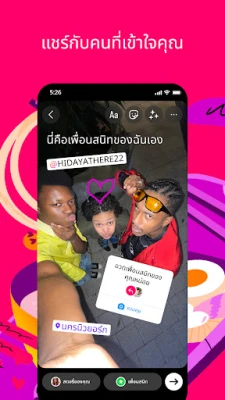 ปลดปล่อยความคิดสร้างสรรค์ของคุณได้อย่างเต็มที่ แบ่งปันช่วงเวลาที่ไม่ต้องปรุงแต่งผ่านสตอรี่และโน้ตที่สดใหม่ ซึ่งจะปรากฏอยู่ 24 ชั่วโมง หรือสร้างบทสนทนาที่สนุกสนานในกลุ่มแชทส่วนตัว นอกจากนี้ เปลี่ยนชีวิตประจำวันให้เป็นภาพยนตร์สั้นๆ สุดประทับใจด้วยฟังก์ชัน Reels ที่มาพร้อมเทมเพลต เพลง สติกเกอร์ และฟิลเตอร์สุดพิเศษ ให้คุณปรับแต่งโพสต์ได้อย่างมีสไตล์ ไม่ว่าจะเป็นบันทึกการเดินทางที่น่าประทับใจ หรือเหตุการณ์สำคัญในชีวิต ฟีดของคุณคือพื้นที่สำหรับเก็บเกี่ยวความทรงจำเหล่านั้น
